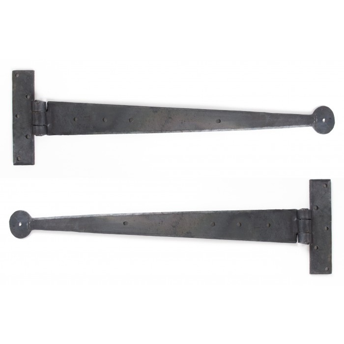 <br />These T Hinges have a ‘penny shaped’ round end and is one of our most popular choices for hanging ledged and braced/plank doors.<br /><br />They are hot forged i.e. drawn to shape, not welded or fabricated and with the knuckle being fashioned in the traditional way it makes for a very strong product.<br /><br />The traditional way of choosing a hinge size means it should reach two thirds of the way across the door but providing it reaches at least half way across it should carry the weight of most doors with no problems. For especially heavy doors a third hinge can be used (three on one door).<br /><br />Sold as a set and supplied with necessary fixing screws.">